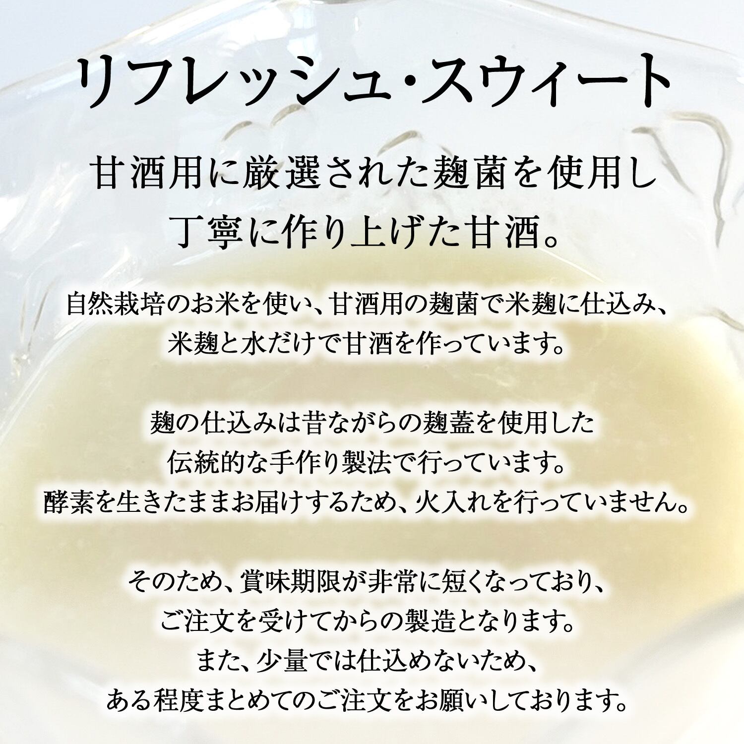 甘酒麹と水だけで仕込んだ、爽やかな甘さが特徴の甘酒となります。